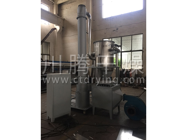 热空气切线进入干燥器底部,在搅拌器带动下形成强有力的旋转风场。膏状物料由螺旋加料器进入干燥器内,在高速旋转搅拌桨的强烈作用下,物料受撞击、磨擦及剪切力的作用下得到分散,块状物料迅速粉碎,与热空气充分接触、受热、干燥。脱水后的干物料随热气流上升,分级环将大颗粒截留,小颗粒从环中心排出干燥器外,由旋风分离器和除尘器回收,未干透或大块物料受离心力作用甩向器壁,重新落到底部被粉碎干燥。