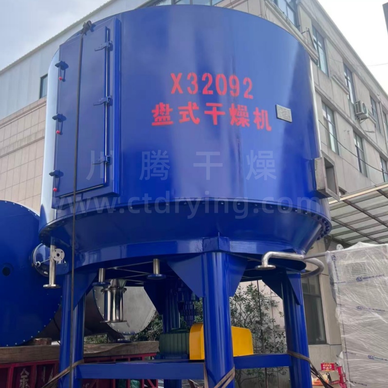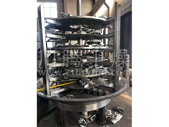 湿物料自加料器连续地加到干燥器上部^层干燥盘上,带有耙叶的耙臂作回转运动使耙臂作回转运动使耙叶连续地翻抄物料。物料沿指数螺旋线流过干燥盘表面,在小干燥盘上的物料被移送到外缘,并在外缘落到下方的大干燥盘外缘,在大干盘上物料向里移动并从中间落料口落如下一层小干燥盘中。大小干燥盘上下交替排列,物料得以连续地流过整个干燥器。中空的干燥盘内通入加热介质,加热介质形式有饱和蒸汽、热水和导热油,加热介质由干燥盘的一端进入,从另一端导出。已干物料从底层干燥盘落到壳体的底层,而后被耙叶移送到出料口排出。湿份从物料中逸出,由设在顶盖上的排湿口排出,真空型盘式干燥器的湿气由设在顶盖上的真空泵口排出。从底层排出的干物料可直接包装。通过配加翅片加热器、溶剂回收冷凝器、袋式除尘器、干料返混机构、引风机等辅机,可提高其干燥的生产能力,干燥膏糊状和热敏性物 料,可方便地回收溶剂,并能进行热解和反应操作。